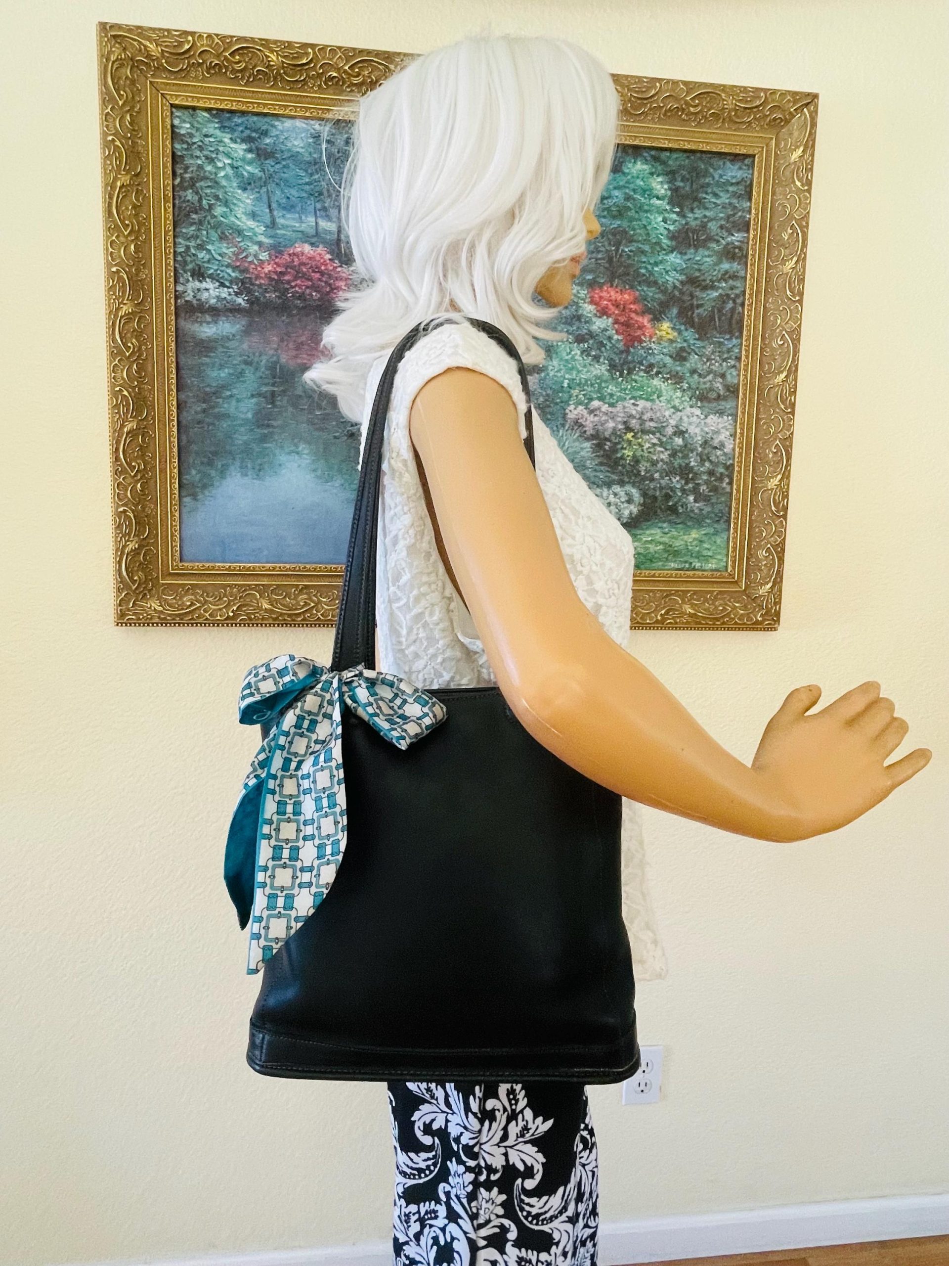 Office Elegance: Pairs well with a business suit, shirt, or pencil skirt. Smooth black leather and a printed scarf add a touch of sophistication to a professional outfit, making it the perfect accessory for the office.