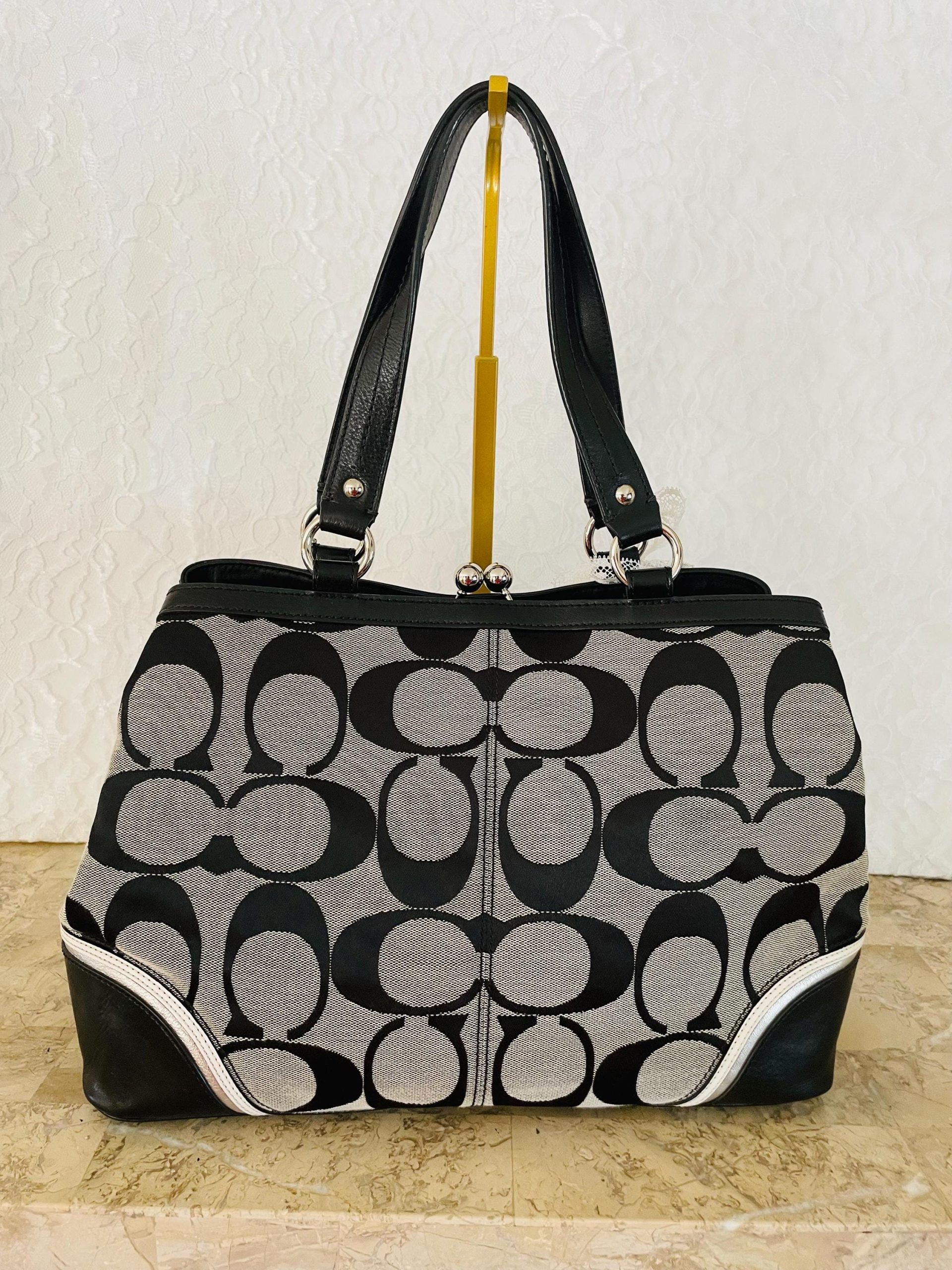 Leather Trim: The black leather handles and base provide practical support and enhance the bag’s style. Polished metal hardware at the junction of the leather and canvas adds a refined touch, enhancing the overall elegance.